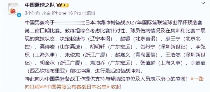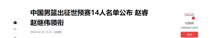 郭士强公布的14东说念主出征名单(赵继伟、赵睿、廖三宁、胡明轩、高诗岩、贺希宁、李弘权、朱俊龙、赵嘉义、王浩然、胡金秋、焦泊乔、张镇麟和余嘉豪)。
